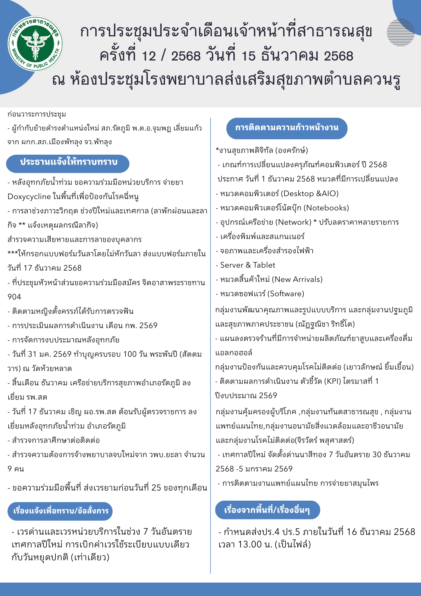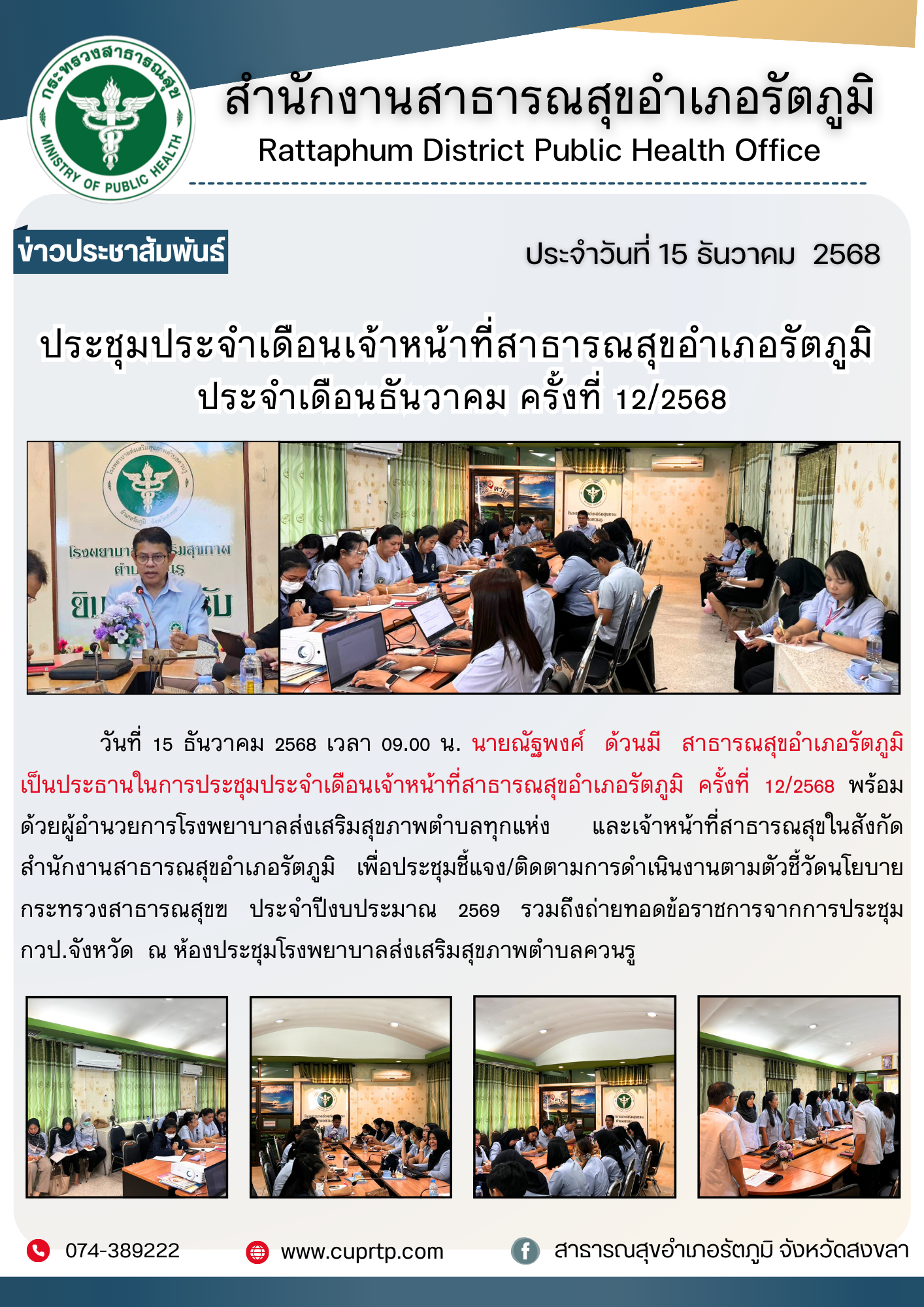 สรุประเบียบวาระการประชุมประจำเดือนสำนักงานสาธารณสุขอำเภอรัตภูมิครั้งที่ 12 /2568